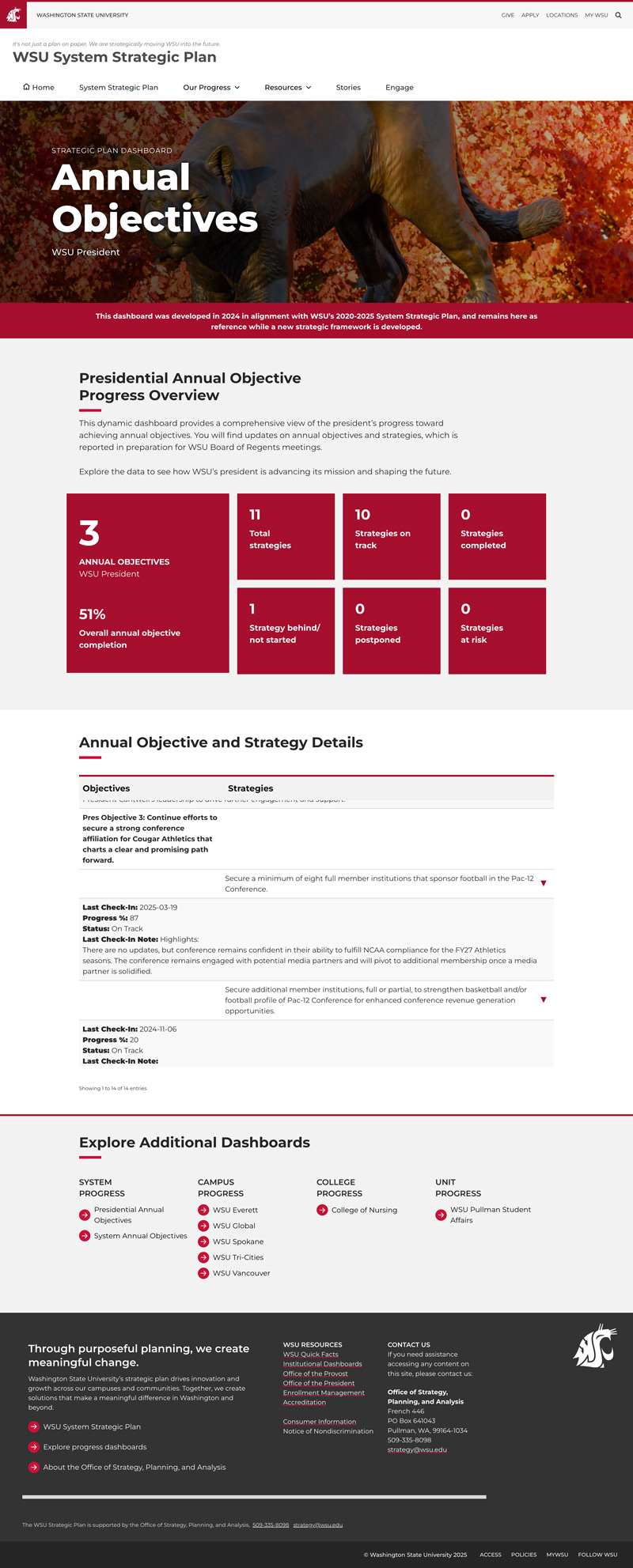 By combining a centralized website, clear visual design, and ongoing reporting, the project made it easier for stakeholders across the university to understand the goals of the strategic plan and see how progress was being made.